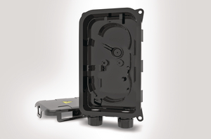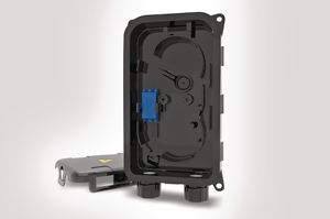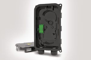 The AFN - Aerial Fibre Node is manufactured from UV stable black polycarbonate with a completely detachable lid which can also be snapped back in to position using the snap back hinges allowing unrestricted access to all fibre management areas. The enclosure has 3 separate management areas for inbound cable, fibre splice management and drop cable (customer connection) management. The inbound cable management area has a dedicated cable entry port which supports both cable end and mid-span applications with loop storage capacity for up to 4m of 144 core fibre cable and the entry port is sealed with a cable entry kit to maintain the IP55 rating. The fibre splice management area has capacity for a maximum of 48 3A splices and maintains positive fibre management (30mm minimum bend radius) throughout. The tray has a crossover facility which allows for alternative routing requirements and a fibre storage capacity of 1.5m for 250µm fibre. The drop cable management area presents 24 SC APC Simplex adaptors for connection to industry standard pre-terminated drop cables and a 6 X 1:4 PLC splitters. The drop cable management area cover prevents access to the network cables and splicing area and the adaptors are angled and spaced to allow for inspection prior to connection. Twelve anchor guides are provided for securing the drop cables (maximum diameter 4.2mm) and an integral seal maintains the IP55 rating. |