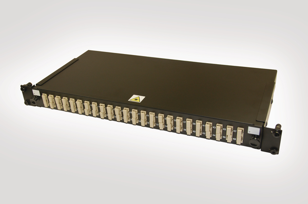 The 19" sliding drawer patch panel with 24 vertical slots for SC adaptors (simplex or duplex). The panel is supplied pre-loaded with the required adaptors with any unused slots fitted with blanking plugs, each fibre port is numbered separately to make identification easier. |