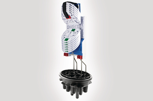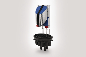 The FDN 16 Port Integrated Routing (IR) AB Length closure is supplied with a Polypropylene base. The base configuration of 15 round ports and 1 oval port covers a cable diameter range of 4.8 – 29.0mm when using Cablelok mechanical seals and 6.0 – 35.0mm when using heatshrink. The moulded supports on the base allow the cover to be removed from the closure whilst it is still in-situ. Bosses moulded in to the closure base enable fixing of external cable management attachments. he mounting system is manufactured from Grade 304 stainless steel and the backplane is an aluminium extrusion which manages 12 SE-IR MKI ANT/Crimp splice trays. The position of the mounting system allows easy access for the routing of the fibre on to the trays. The trays and fibre optic routing module are white which makes it easy to see the colour of the fibre elements as they are routed through the positive fibre management system. Fibre slot retaining blocks guide fibre elements in to the IR system, the foam pad on the retainer is partially cut through to accommodate a range of fibre counts. All IR system cover plates are coloured blue identifying them as removable parts allowing access to the fibre, the fibre slot retaining block and tray retaining clips are coloured red to aid in identification if they are dropped. |