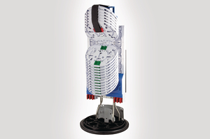 The FDN 16 Port Integrated Routing (IR) B Length closure with basket is supplied with a Polypropylene base. The base configuration of 15 round ports and 1 oval port covers a cable diameter range of 4.8 – 29.0mm when using Cablelok mechanical seals and 6.0 – 35.0mm when using heatshrink. The moulded supports on the base allow the cover to be removed from the closure whilst it is still in-situ. Bosses moulded in to the closure base enable fixing of external cable management attachments. The mounting system is manufactured from Grade 304 stainless steel and the backplane is an aluminium extrusion which manages 48 x SC-IR MKI moulded splice holder trays. The position of the mounting system allows easy access for the routing of the fibre on to the trays and the basket provides storage space for the storage of fibre loops. The trays and fibre optic routing module are white which makes it easy to see the colour of the fibre elements as they are routed through the positive fibre management system. Fibre slot retaining blocks guide fibre elements in to the IR system, the foam pad on the retainer is partially cut through to accommodate a range of fibre counts. All IR system cover plates are coloured blue identifying them as removable parts allowing access to the fibre, the fibre slot retaining block and tray retaining clips are coloured red to aid in identification if they are dropped. |