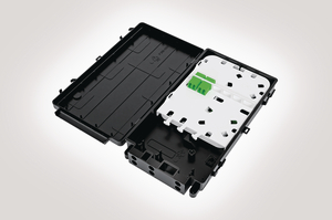 | Technical Description | The Multi Customer Connection Enclosure (MCCE) has been designed as a Building Entry Point (BEP) to provide a fibre termination and network demarcation point external to the connected premise in a Fibre to the Home (FTTH) network. In addition to providing an external test point the enclosure can also accommodate up to 12 customer fibre connections. The MCCE has an IP54 sealing performance with up to 6 entry/exit ports at the bottom of the enclosure which is suitable for cables or ducts up to a maximum diameter of 8mm. A loop through facility allows for single fibre elements to be removed and spliced whilst the remaining fibres can be fed on to the next connection point. Mechanical fixing is provided to secure all incoming/outgoing cables/blown fibre ducts and to provide strain relief where necessary. Internal positive fibre management and fibre retention clips maintain a minimum 30mm bend radius throughout. The MCCE is supplied with 2 x LC duplex adaptors and 4 x 1m pigtails and has features to secure a maximum of 6 fibre splices. The lid is hinged allowing quick and clear access to the internal fibre for splicing and termination and the lid can be replaced if damaged. |
