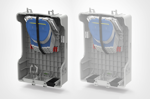 The HellermannTyton S4 wall mountable enclosures are suitable for both internal and external applications and have been developed for use within the last mile of the FTTX network. The medium MDU enclosure is 470 x 307 x 147mm (H x W x D) and manufactured in light grey (RAL 7035), UV stable ABS (Acrylonitrile Butadiene Styrene) and has an IP54, IK08 and UL-94 V0 rating. The MDU S4 cover can be customised with a moulded or labelled customer logo. The S4 C (Connectorised) can be configured with the large angled IR Fibre Management System which accommodates 6 SC-B IR MKII splice trays and 4 Connectorised trays (CTR) and up to 6 PLC splitters. A loop through anchor bracket is pre-fitted on the left port of the base. The dual outlet of the bracket allows for loop through applications. The black rubber seals cover a cable range of 3-14mm OD cable. The position of the FMS in the centre allows for horizontal splices and the additional lateral patch cord manager makes the fibre routing easier. The 4 red retaining blocks guide the fibre elements onto the FMS and their foam pads can be cut through to accommodate a range of fibre counts. One multi-drop seal (24 x 7mm drops) is pre-fitted on the right port of the base. An extensive range of optional accessories is available upon request and include lock, multi-drop seals (24 x 7mm), M20 and M25 cable glands (up to 18mm), loop through anchor kit, drop cable anchor brackets, SC or coloured splice trays, splitter holders for trays, internal or external loop storage baskets. |